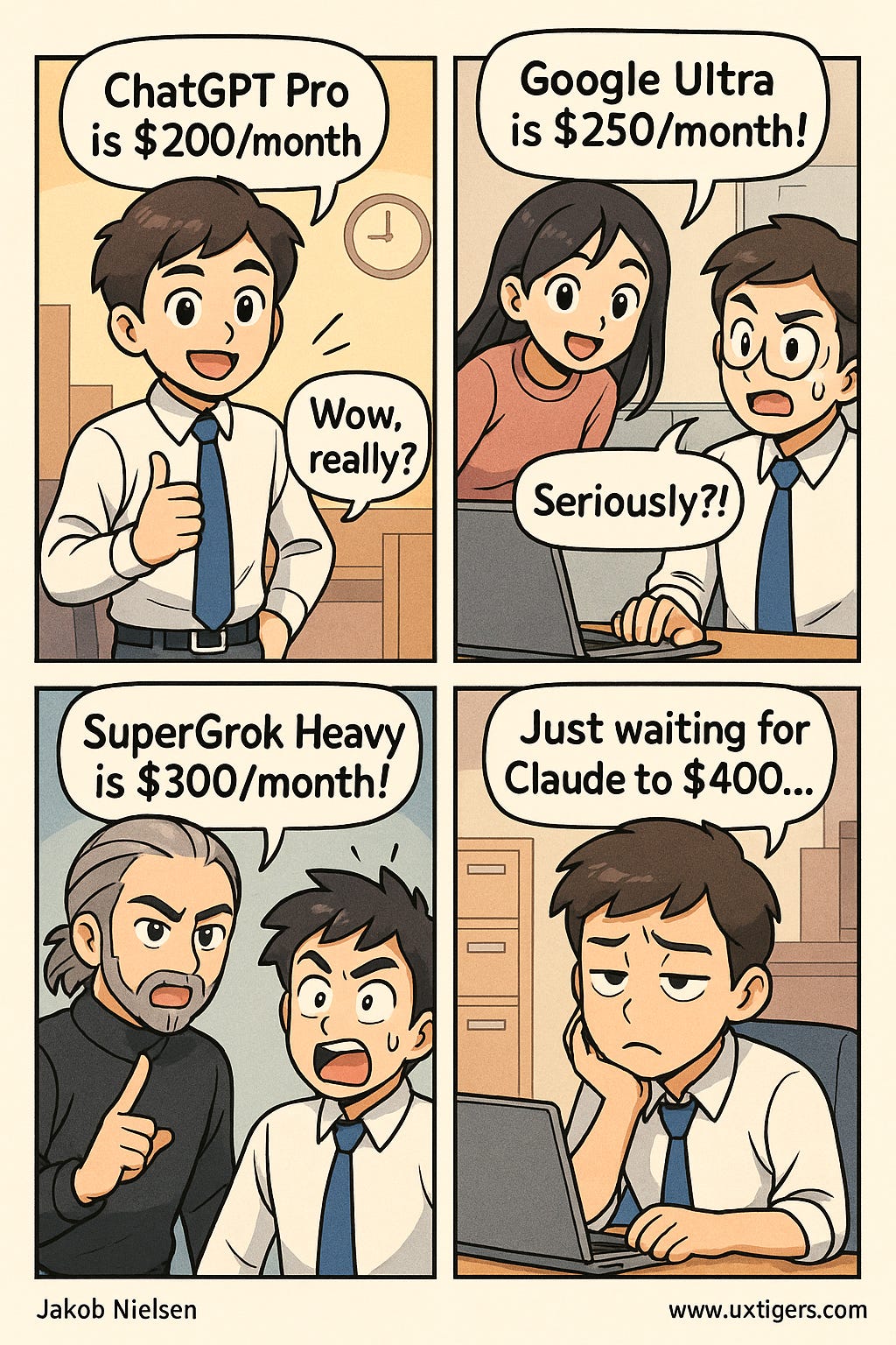 My worry is not $300 for SuperGrok Heavy, the $200 for OpenAI ChatGPT Pro, or the $250 for Google Ultra with extra Veo3 generations. Any of these expenses can easily be recovered. (And any decent company should reimburse employees for spending that much on AI.) The problem is the cumulative cost of putting all the subscriptions together.