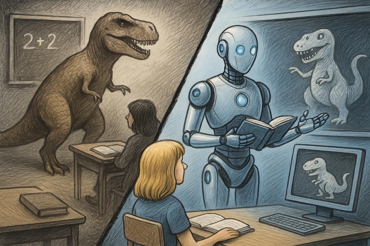 However, there’s a new crop of AI-Native schools, exemplified by Alpha School that demonstrates AI’s potential, where students, are able to learn the traditional curriculum in two hours of classroom sessions per day due to individualized teaching by AI tutors. This leaves the rest of the school day for more creative types of projects. I hope that these non-curricular projects will teach the kids the three job skills for the AI age: agency, judgment, and persuasion. In fact, I wonder why future-oriented schools bother teaching the old curriculum at all, even if they can disperse with it more efficiently with AI teaching. In the future, all traditional “hard-skills” style knowledge work will be done by AI, so there is no need for students to learn things they will never use once they are released from the education system. (I think they still ought to learn to read, which is interestingly done poorly by the current curriculum, where many students graduate from high school as functional illiterate.)