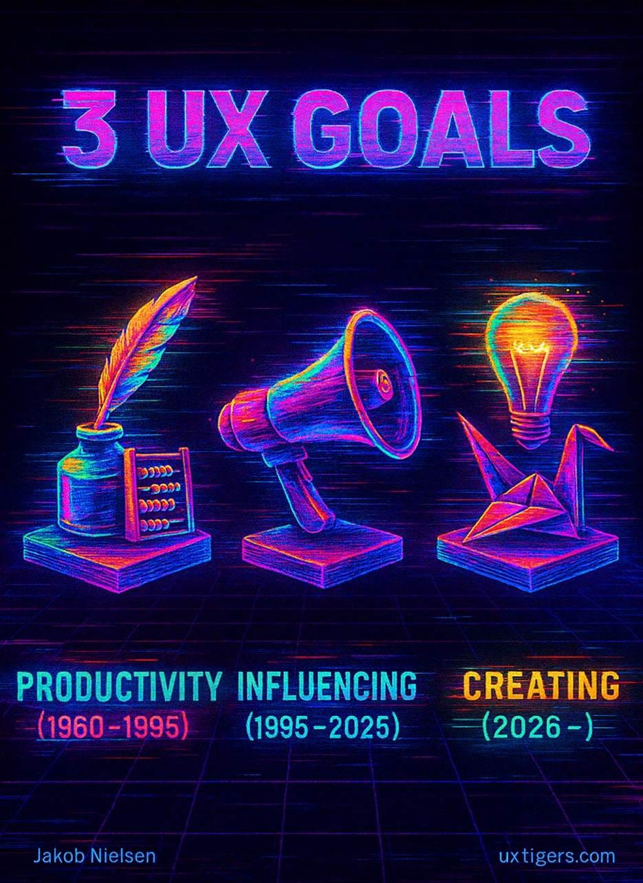 GPT Image-1: UX design has progressed through three main goals: initially, in the mainframe and PC eras, we aimed to improve employee productivity when using our software. During the web era, influencing consumers to buy or stay on our website became more important. The AI era will be a time of individual empowerment and creativity, especially with generative AI, whereas AI agents will handle traditional work and purchasing.