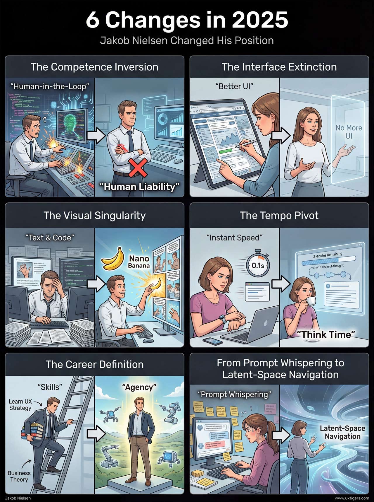 I urge UX professionals to pivot toward strategy and orchestration. The value of a designer shifts from making the thing to defining the right thing to make. “Learn UX Strategy” provides a roadmap for this evolution, encouraging designers to learn the language of business, ROI, and competitive advantage. Finally, my “Agency Manga” article used visual storytelling to dramatize this high-stakes environment, showing the emotional toll of this transition. The overarching message is clear: to survive, UX professionals must stop being user advocates and become strategic partners who wield AI to drive business growth.