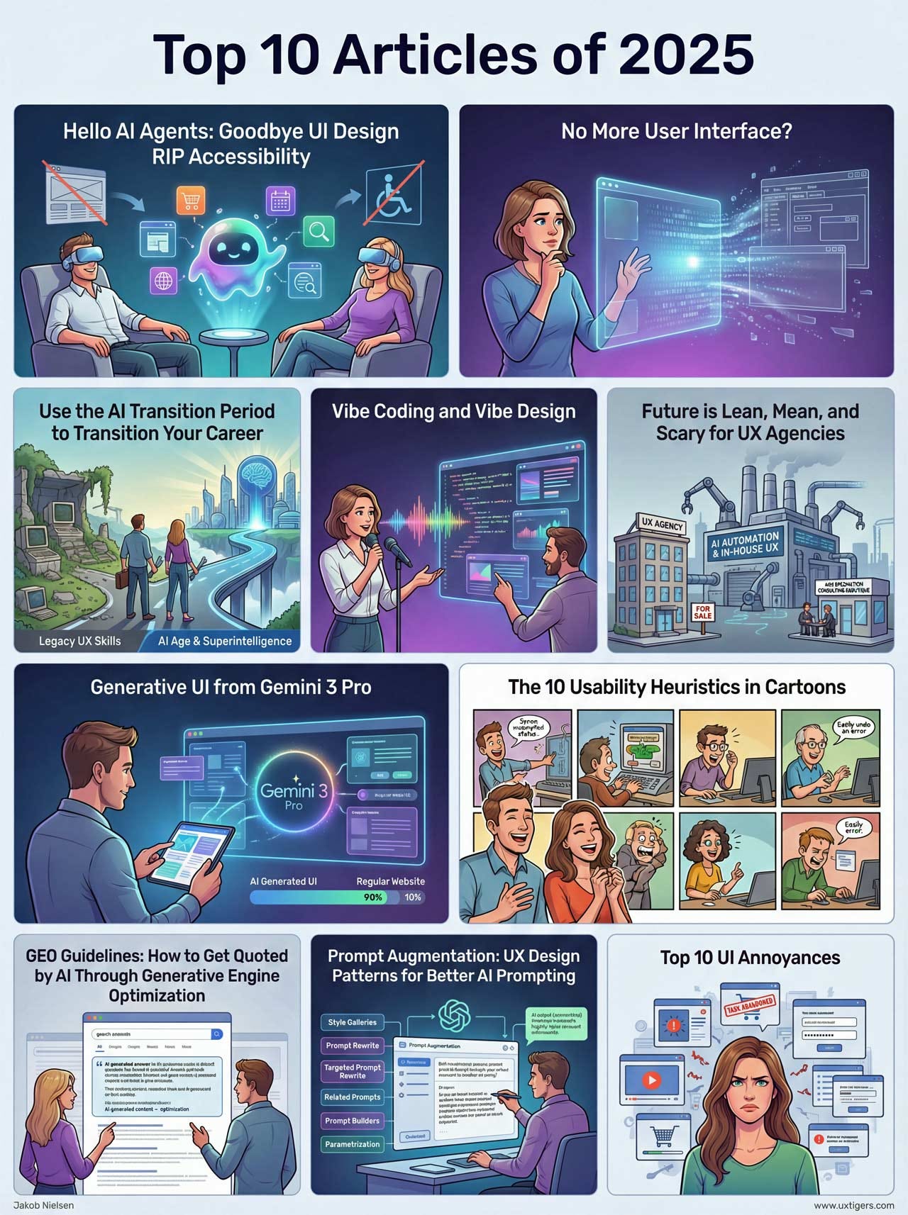 What made my “change” coverage feel coherent is not agreement; it is insistence on the same evaluative stance. My posts treated AI as simultaneously tool, user, coworker, and channel; and I kept checking how those roles collide inside real interfaces. Sometimes the collision is optimistic (new creative workflows, new UI forms, better synthesis); sometimes it is grim (automation pressures, entry-level job erosion, accessibility risk, and the creeping disappearance of “UI” as a stable object of design). My 100 articles from 2025, taken together, read like a year-long argument that UX is no longer a set of screen rules. It is a discipline of steering systems whose behavior changes faster than your design system can be updated.