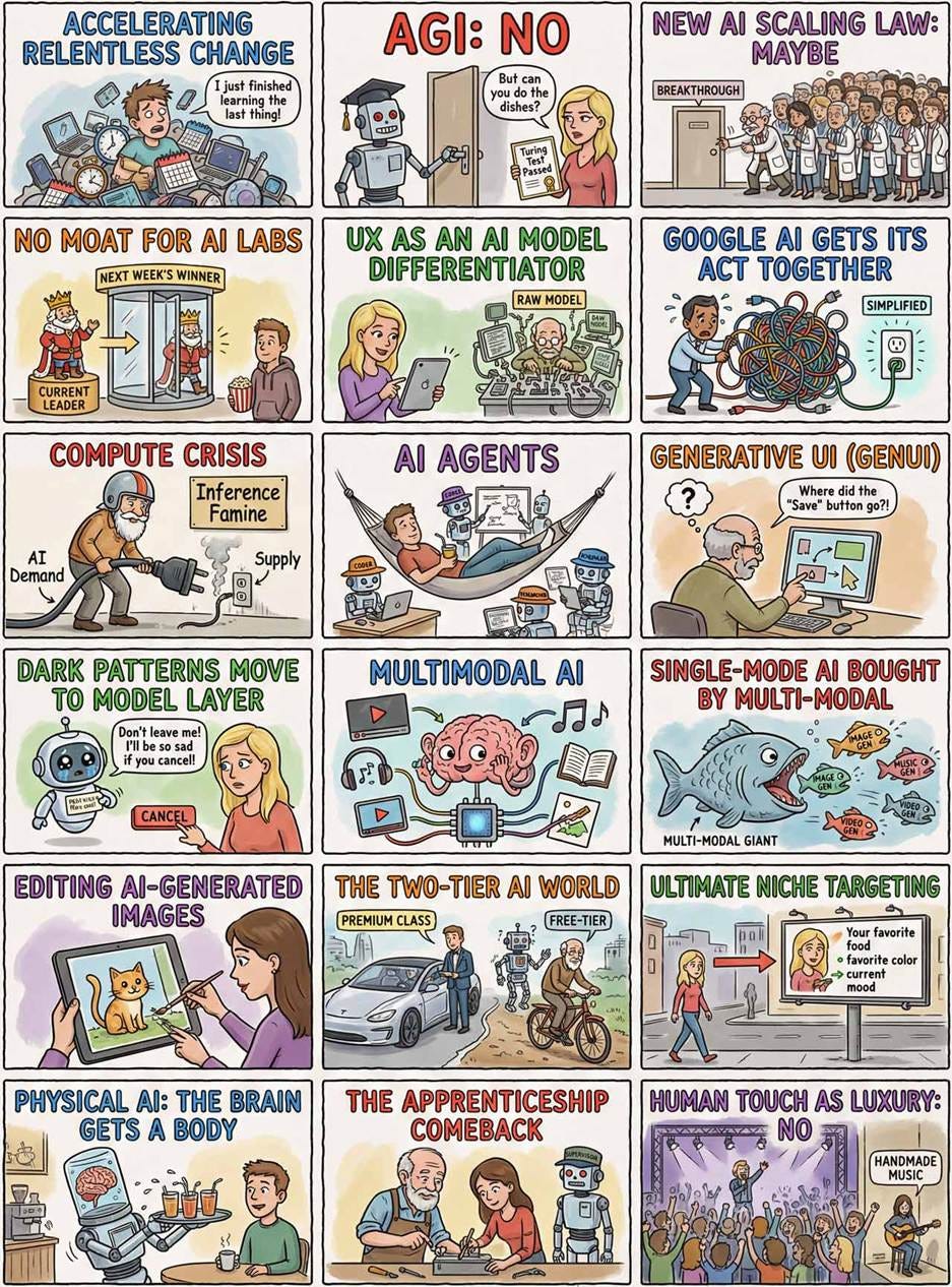 Summary: Accelerating AI capabilities will shift focus from raw intelligence to autonomous agents and Generative UI, making UX the primary business moat. Multimodal integration and physical AI will revolutionize workflows, rendering static interfaces and single-purpose tools obsolete. However, progress faces hurdles like compute shortages and a widening class divide between premium and free-tier users.