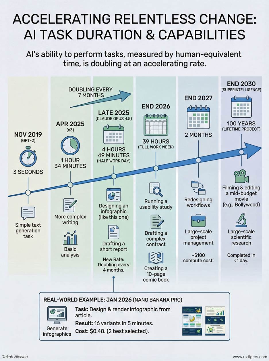 What’s a one-week task for a human? Perhaps running and analyzing a quick “discount” usability study. I don’t think AI will excel at identifying usability problems based on user behavior observations by December 2026, but it should carry out all the steps of the user testing process. Other examples: a lawyer drafting a complex business contract, or a cartoonist writing and drawing a short comic book story at the fairly low complexity of classic “Silver Age” superhero comics (usually around 10 pages).