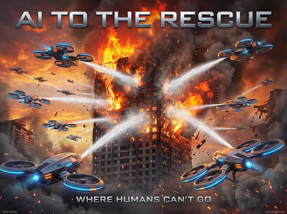 AI-operated firefighting drones will save many lives, both civilians and human firefighters. (Nano Banana Pro)