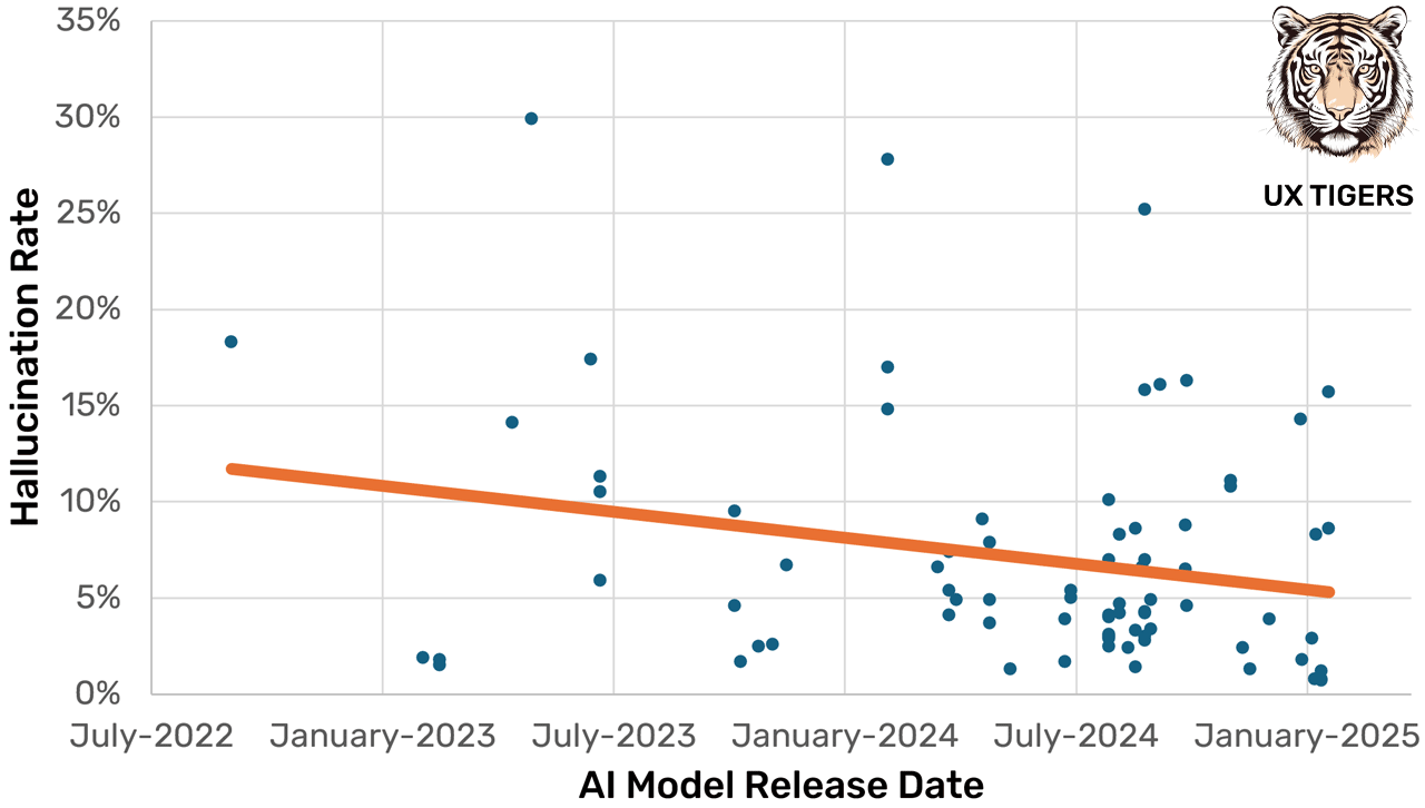 Summary: Early AI products proclaimed many falsehoods, but such hallucinations are getting fewer with modern AI products. In particular, larger models have reduced hallucination rates. Waiting for better AI models while developing complex AI products is a good strategy, but better UX design can mitigate the hallucination problem with current AI models.