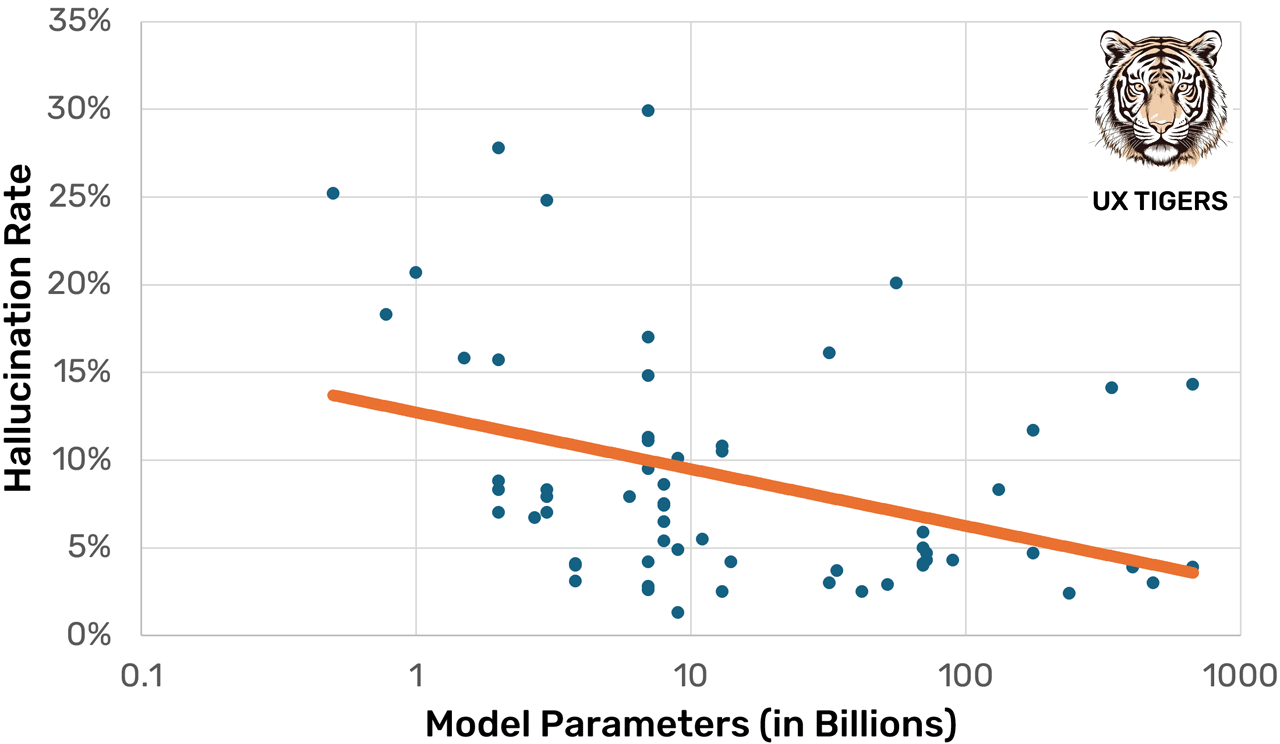 Here, the regression line shows that hallucinations drop by 3 percentage points for each 10x increase in model size.