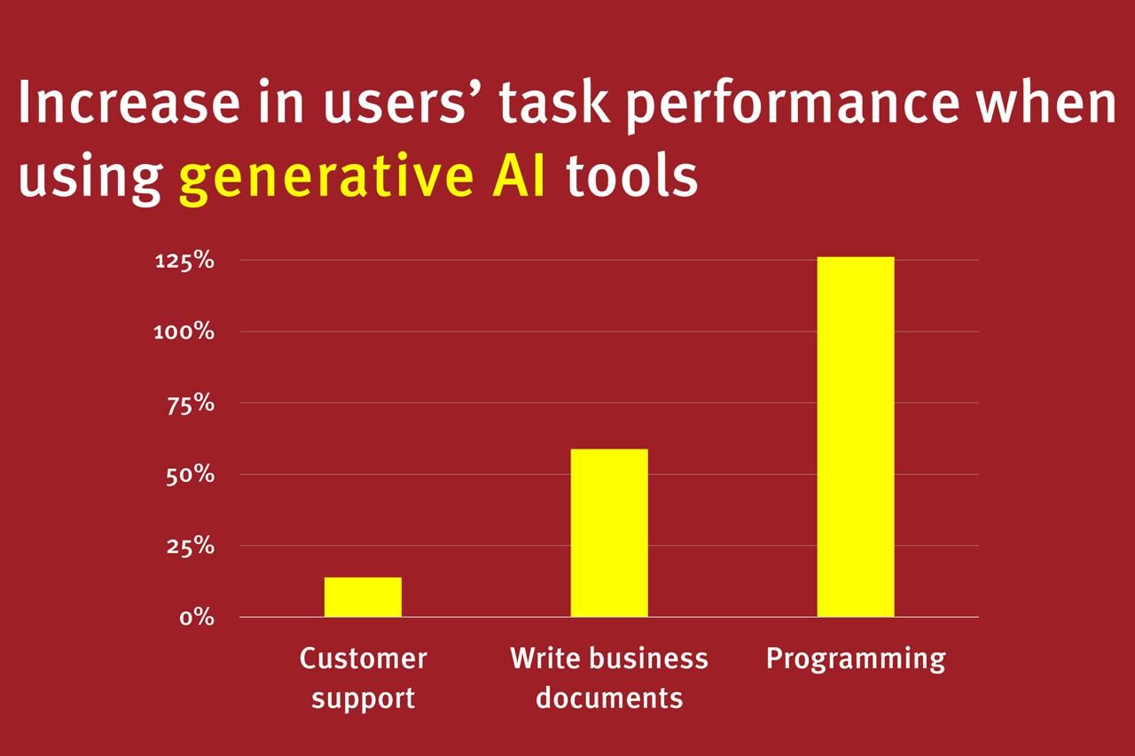 The measured increase in users’ task performance when using generative AI tools (relative to control groups of users who did not use AI), according to the three research studies discussed here.