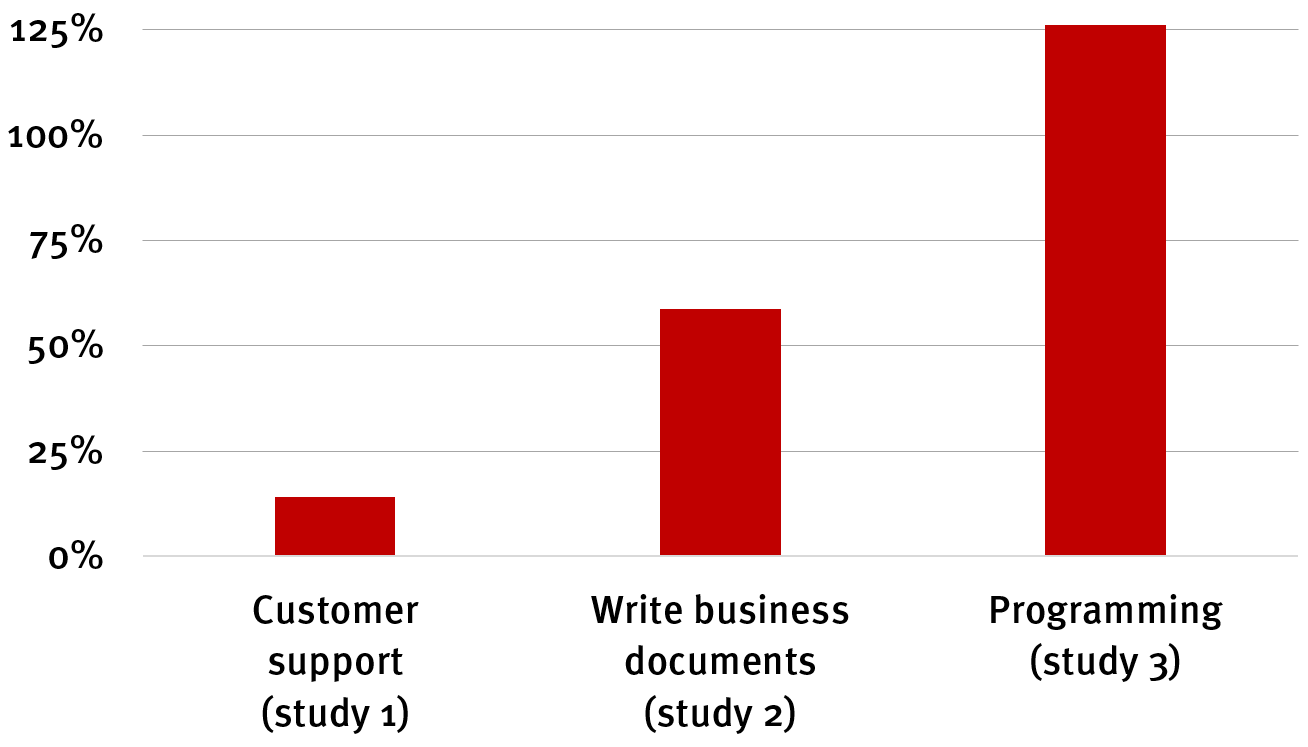 The three studies were very different and yet arrived at the same results. This vastly increases my faith in the conclusions. Any single study can be wrong or misleading for several reasons. But credibility shoots through the roof when different people find the same thing in different domains with different research methods. The lead authors of these three case studies were from Stanford, MIT, and Microsoft Research, respectively. They studied customer support agents resolving customer inquiries, business professionals writing routine documents, and programmers coding an HTTP server. As you’ll see if you read on, each research team used different study protocols and different metrics.