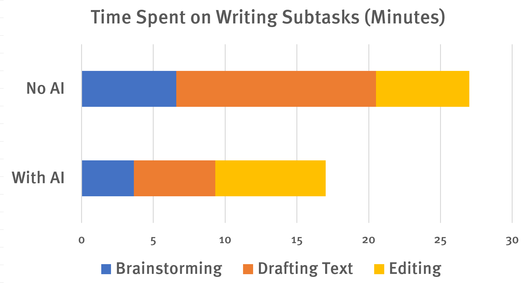 Bar chart showing the average time in minutes spent on the three stages of writing a document: [1] deciding what to do (called “brainstorming” by the researchers), [2] generating the raw text for the first draft, and [3] editing this draft to produce the final polished deliverable. The top bar shows the average times for users who wrote their document the usual way, without AI assistance, whereas the bottom bar shows the average times spent by users who employed ChatGPT.