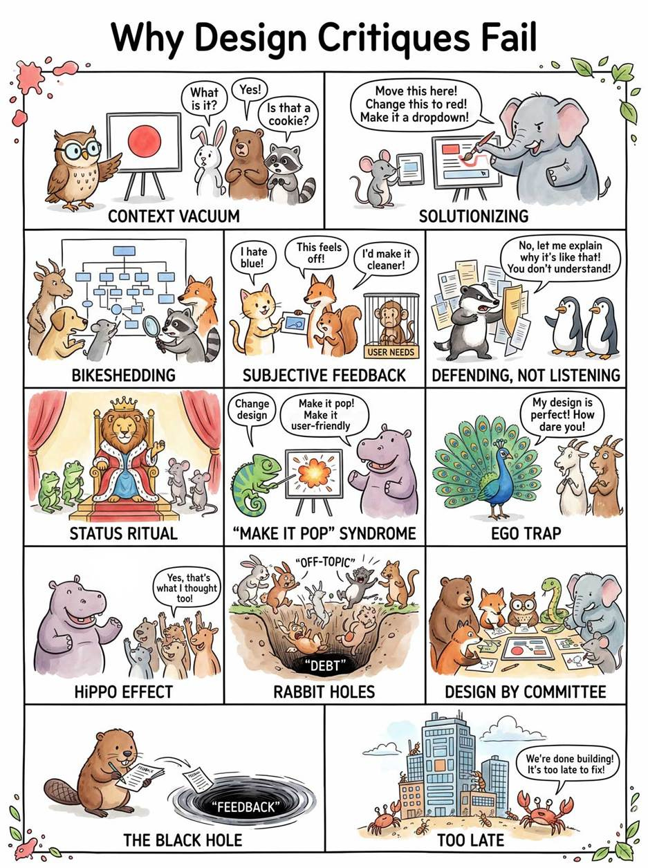 Underneath these unlucky thirteen mistakes, one pattern appears again and again: the critique stops being a method for examining design decisions and becomes a social event organized around opinion, hierarchy, and momentum. Once that shift occurs, even intelligent feedback loses value.
