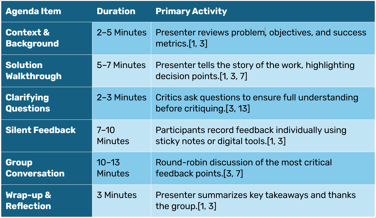 To maximize the time spent in the session, leading organizations implement the 24-Hour Context Share. By distributing design materials, project background, and specific feedback requests at least one day in advance, critics have the opportunity to move past surface-level reactions and develop thoughtful, objective insights.[7] This preparation transforms the quality of feedback from reactive comments (e.g., “I don’t like this color”) to structural inquiries (e.g., “How does this color choice support the accessibility needs of our primary persona?”).[7]