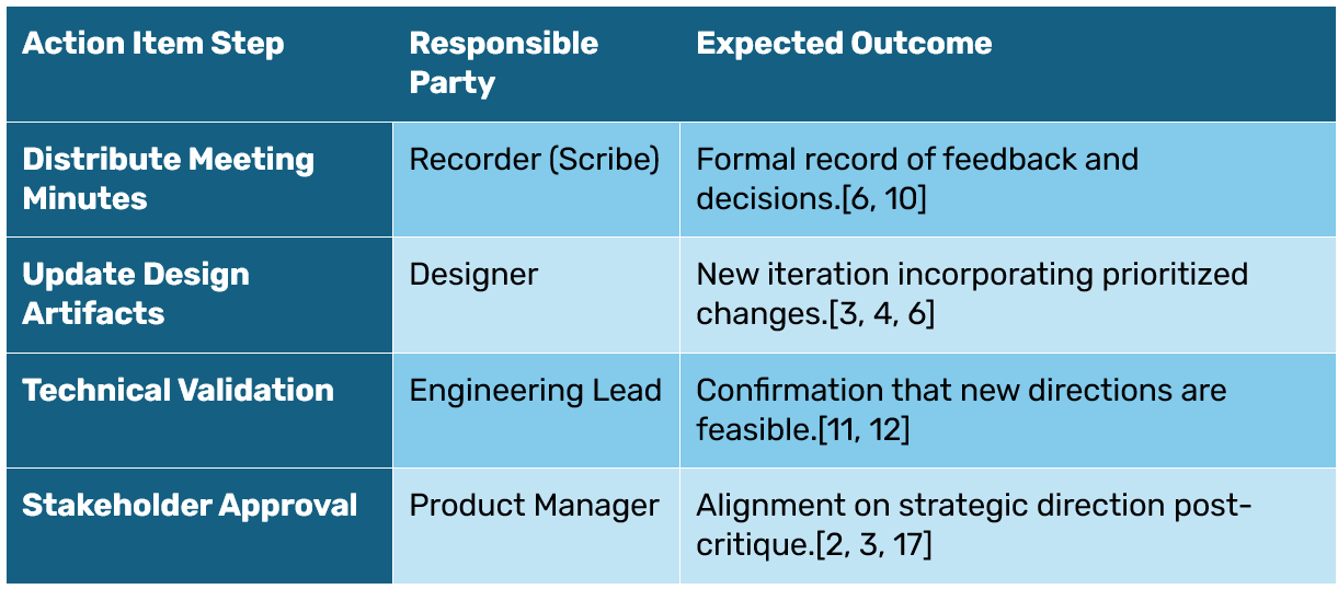 The final application of AI in the critique process is to critique the critique itself.[44, 48] By analyzing meeting summaries and effectiveness reports, facilitators can see whether the session followed the agenda, honored time boxes, and produced feedback categories that actually improved the design. That meta-analysis turns critique from a ritual into a system that learns.