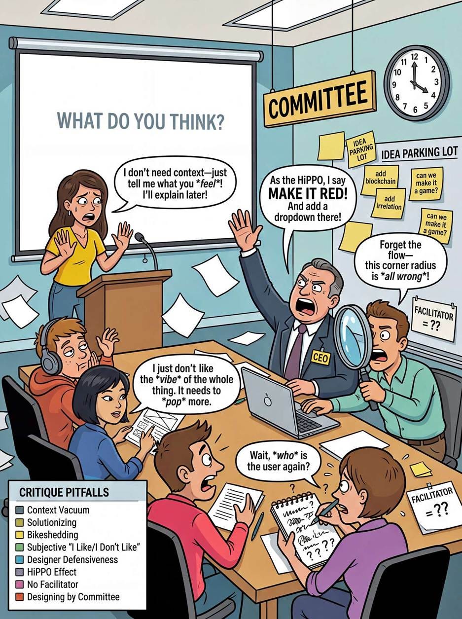 How to avoid or fix it: Establish upfront that the critique is for gathering perspectives and identifying risks, not making final decisions. The designer is the ultimate owner of the work. They are responsible for listening to all feedback, but they alone synthesize it and decide what actually gets implemented.