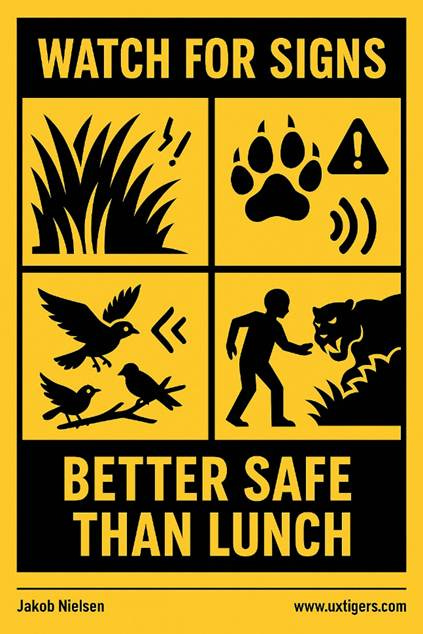 The early hominins didn’t have workplace safety hazard posters, but those of them who were better at connecting the signs of a dangerous predator with the likely presence of that predator would be less likely to be eaten and thus more likely to have passed their genes down to us. (GPT Image-1)
