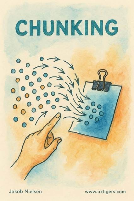 In chunking, instead of thinking of multiple distinct items, the brain groups them into one “chunk” that’s processed as a single item. Having the chunks be “bigger” (cover more information) doesn’t matter for mental efficiency. (GPT Image-1)