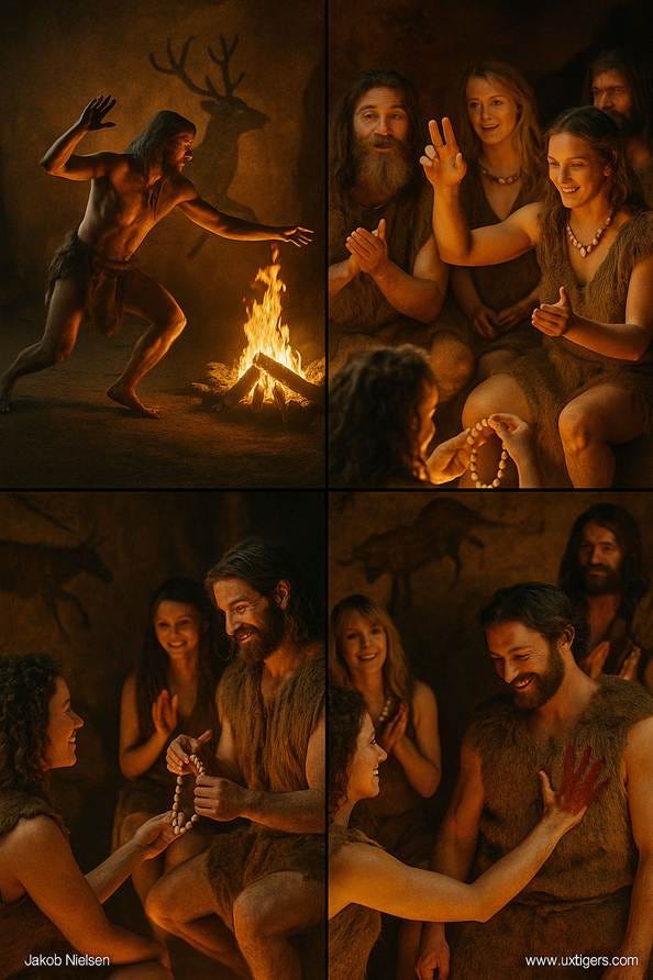 The dancer who could best mimic a stag would win audience applause and prestige in the band. He got the girl, and therefore we carry his metaphor-supporting genes today instead of the genes of his brother, who was less skilled with metaphors. (GPT Image-1)