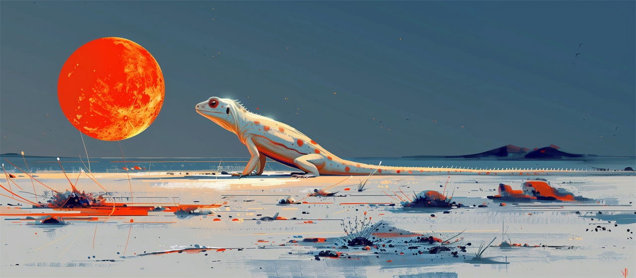 The better image-generation tools, such as Midjourney, currently offer a limited form of delta promoting in the form of inpainting. (Called “vary region” in Midjourney.) The user can select an area within the image and ask the AI to regenerate those pixels while leaving the rest of the image unchanged. The following before-after pair of images show an example of how this feature can be useful when we have a picture where we’re satisfied with the overall composition but need an element to be changed.
