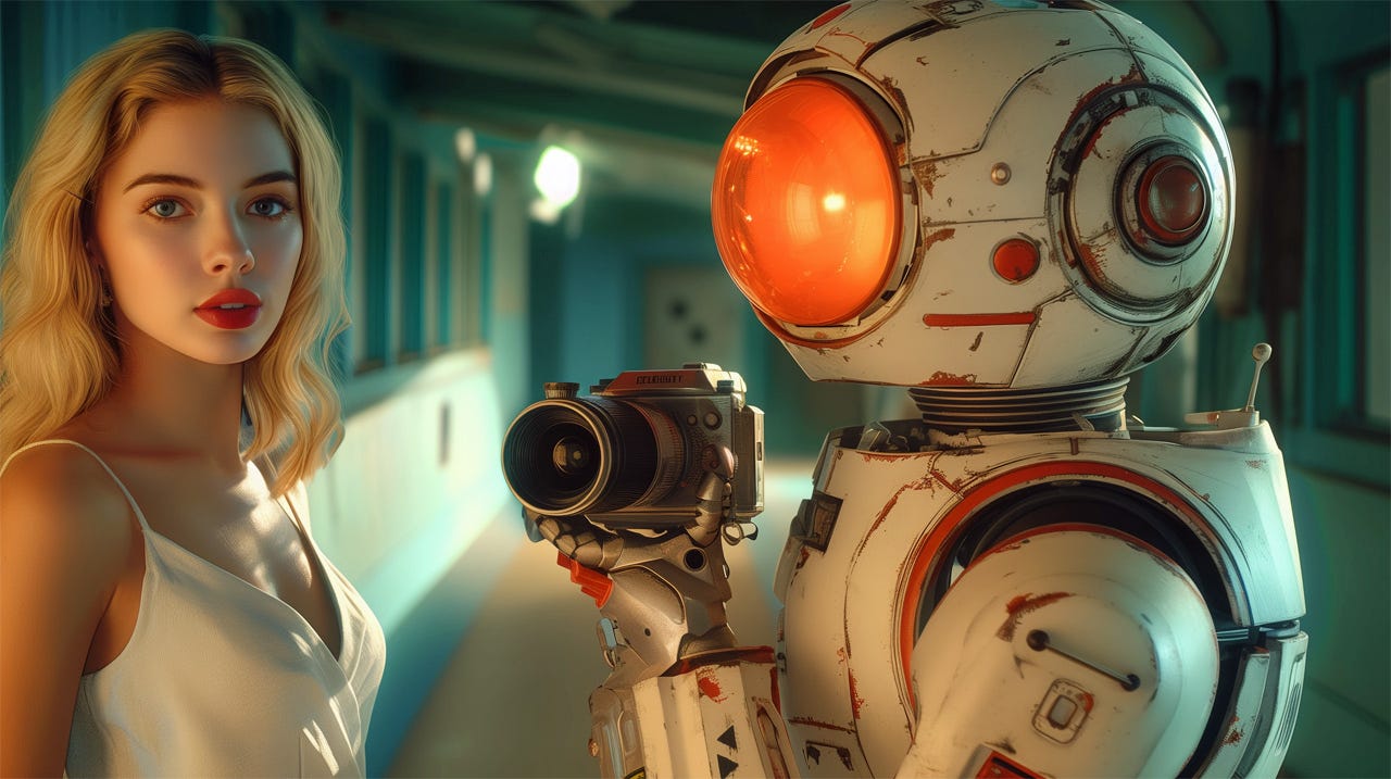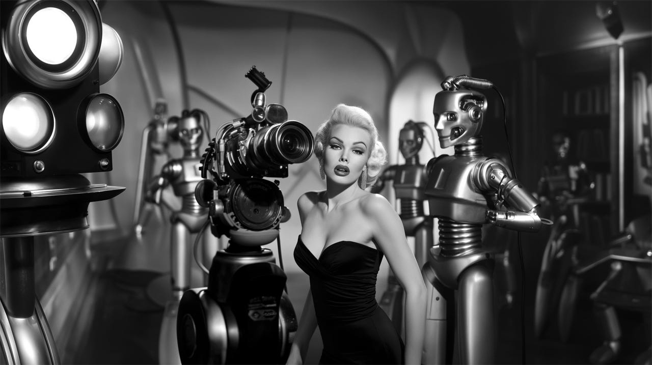 AI-generated movie stars and camera crew ensure basic craftmanship: the images will always be in focus and look good. But what will our artificial actress be saying? (Midjourney)