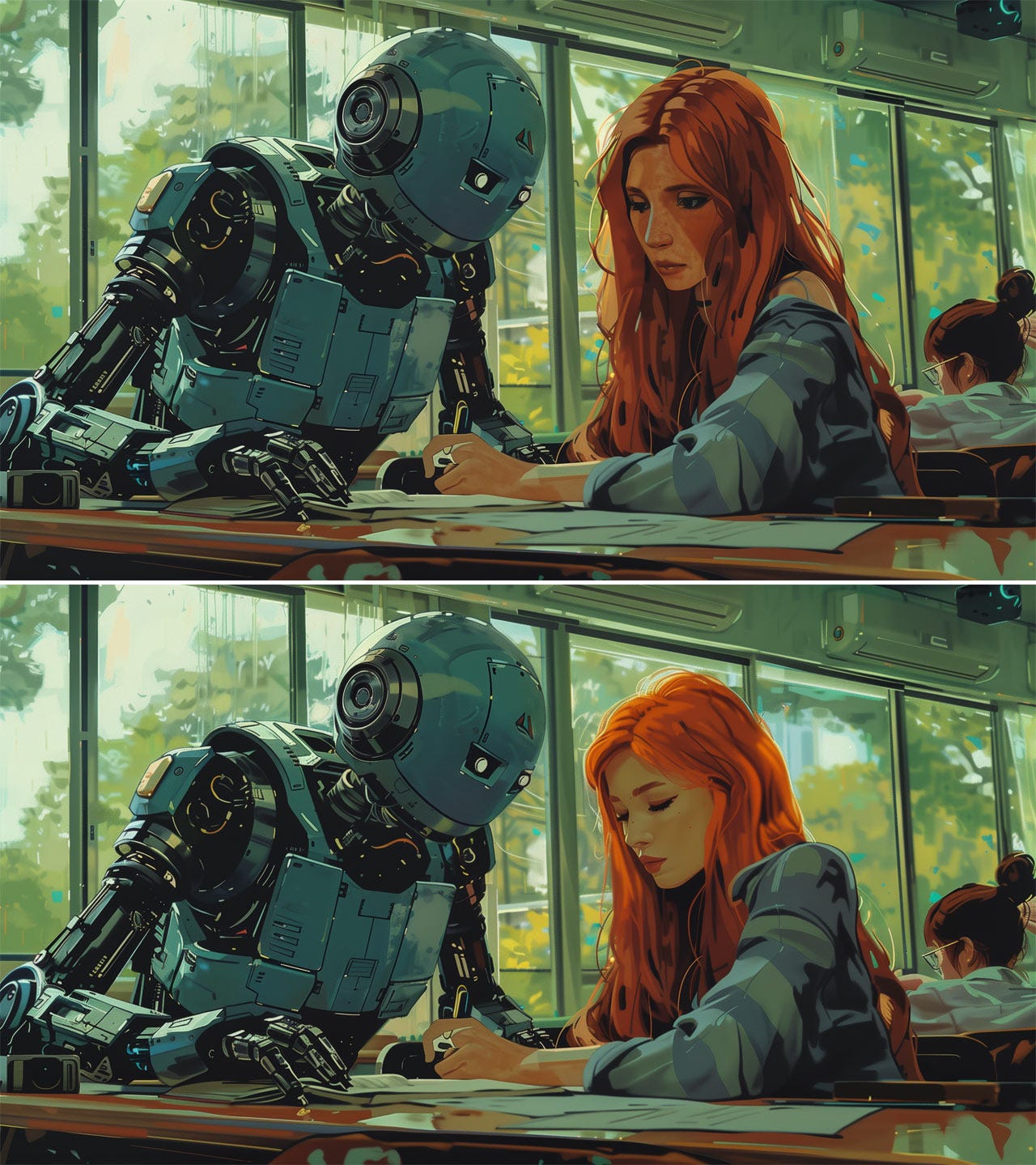 An image I made with Midjourney for a forthcoming piece about having AI inspect your work. In the original image (top), the human designer looks too glum to accept even constructive feedback from the AI. I defined an inpainting area around her face and asked Midjourney to recreate this area with a more accepting facial expression (bottom).