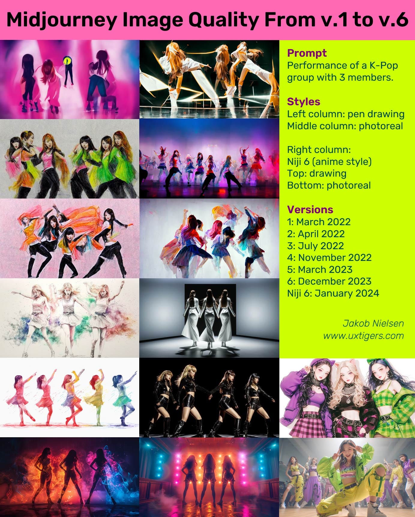 Midjourney has improved its image quality and prompt adherence dramatically in only two years. Versions 1-3 were practically useless. Version 4 (which launched November 2022) and 5 (March 2023) were decent, and version 6 (December 2023) now creates stunning images, as shown in this simple comparison of the same prompt used with the different versions. The early versions couldn’t even count to 3, and version 6 still makes many mistakes, so I expect better from version 7. [Feel free to copy or reuse this infographic, provided you give this URL as the source.] Click this image to see a larger version.