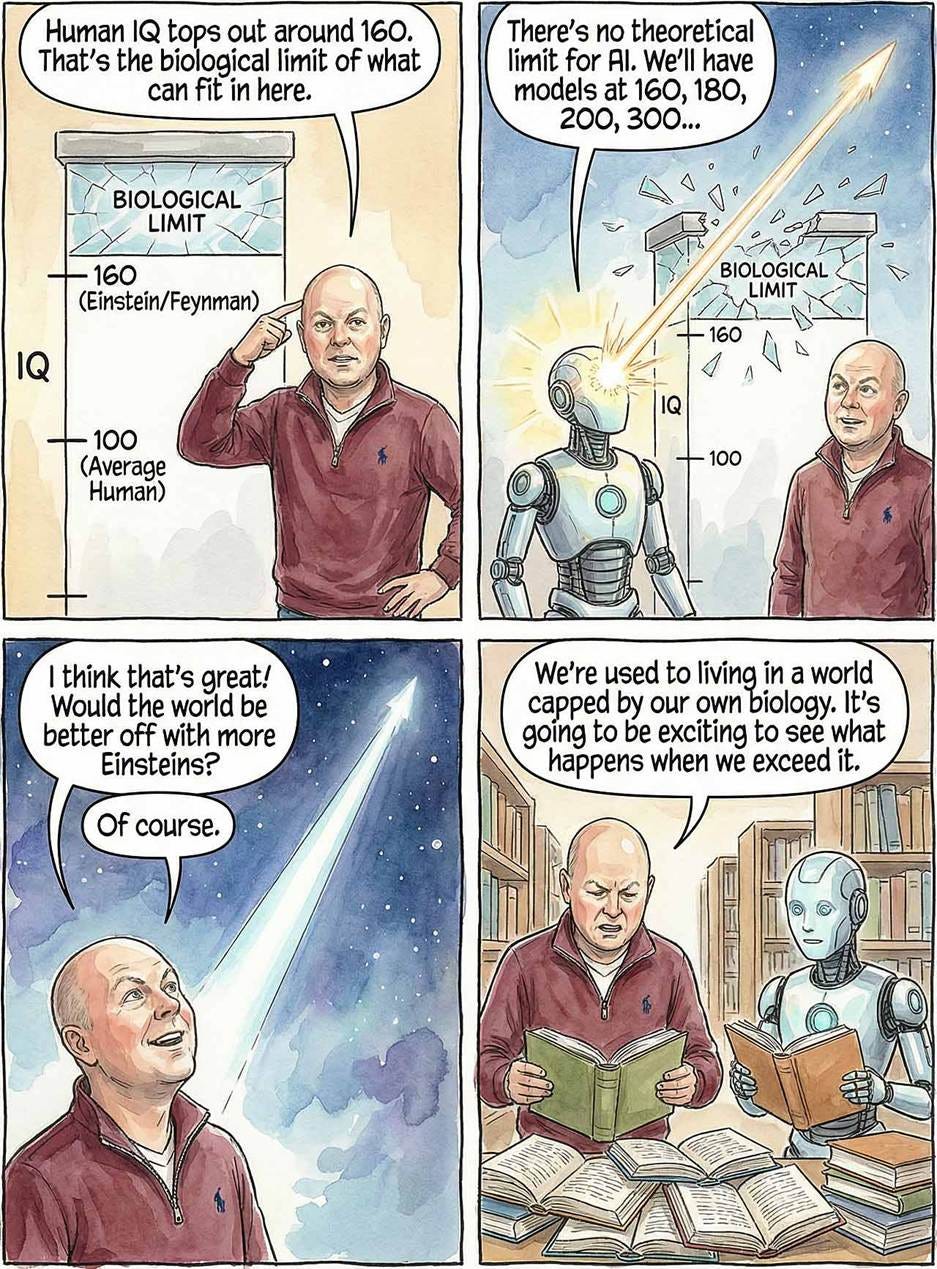 Marc challenges the common framing of AGI as “human-equivalent intelligence,” arguing it dramatically understates AI’s potential. Human IQ tops out around 160 due to biological limitations: Einstein-level intelligence that produces breakthrough physics. Current AI models test around 130–140, approaching and in some mathematical domains reaching 160-level performance. But unlike humans, AI has no biological ceiling: Marc anticipates AI will reach 160, then 180, then 200, 250, 300 and beyond. This isn’t frightening, it’s wonderful, like having access to more Einsteins. We’ve been capped by our own biology for so long we don’t understand how good “good” can get. The ability to harness 300-IQ tools for medicine, science, and engineering represents unprecedented human augmentation rather than replacement.