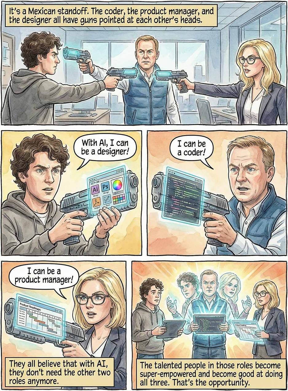 Marc describes a “Mexican standoff” among product managers, designers, and engineers: three roles that have traditionally operated in separate silos. Now, every coder believes they can also be a product manager and designer because they have AI; every product manager thinks they can code and design; every designer knows they can do the other two roles. The fascinating part, Marc notes, is that they’re all essentially correct since AI really is good at all three functions. The traditional stovepipe career paths may disappear, replaced by superpowered individuals who combine capabilities across all three domains. Rather than viewing this as threatening, Marc sees enormous opportunity: talented people in any of these roles can expand laterally, becoming extraordinarily valuable because they can build and design products from scratch, which is the most valuable capability of all.