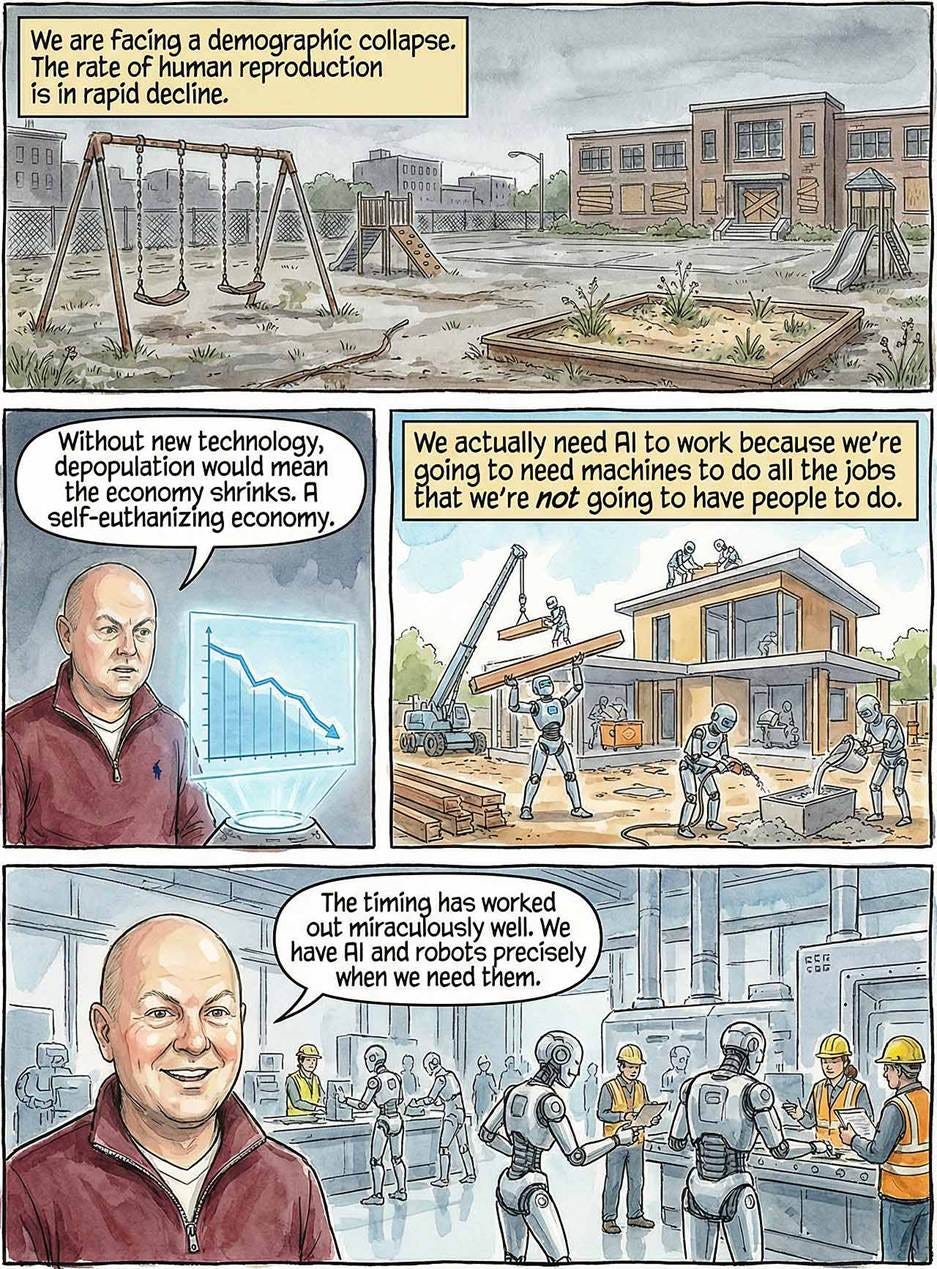 The eleven points covered in my comic strip (the full video has more) converge on a single urgent conclusion: humanity stands at an inflection point where the tools for unprecedented creation are available, but capturing their value requires action, agency, and ambition. The philosopher’s stone exists: AI transforms common inputs into extraordinary outputs. Elite education is democratized through AI tutoring. The demographic crisis creates urgent demand for productivity solutions.