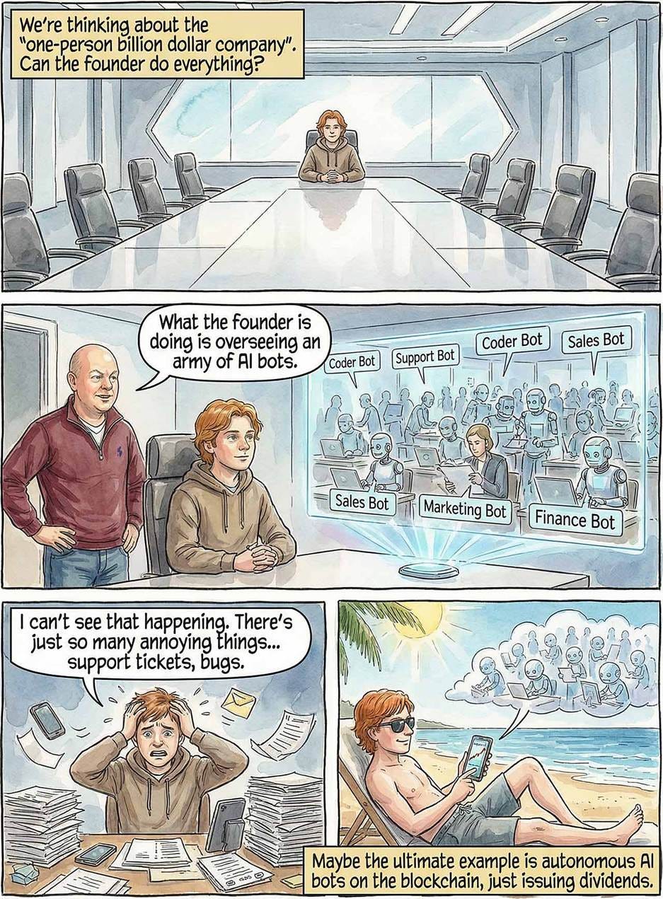 Marc identifies the “one-person billion dollar company” as a kind of holy grail in Silicon Valley, with Bitcoin (Satoshi Nakamoto) being the most spectacular example, followed by Ethereum and exits like Instagram and WhatsApp, all built by tiny teams. Most software companies still end up with large headcounts, but Marc notes that leading-edge founders are questioning whether AI fundamentally changes the definition of what a company requires. He speculates about whether founders can build entire companies by overseeing an army of AI bots, or even whether autonomous AI agents on blockchains could function as businesses issuing dividends with no human involvement at all. While acknowledging the open question of whether contractors count and the inevitable “annoying edge cases” that still require human attention, Marc confirms this represents the cutting edge of founder thinking.