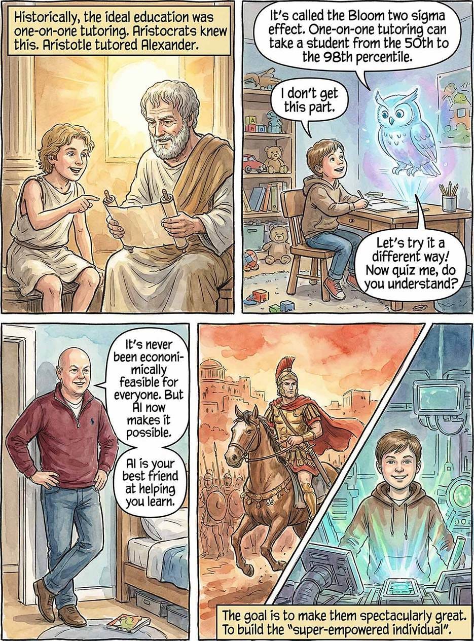 Bloom’s “two sigma effect” is a well-documented finding that one-on-one tutoring routinely raises student outcomes by two standard deviations, taking a child from the 50th percentile to the 98th percentile. Marc notes this has been known for centuries, with every royal family and aristocratic class understanding it, citing Alexander the Great being tutored by Aristotle as the prime example of how personalized education produces world-changers. The problem, Marc explains, is that one-on-one tutoring has never been economically feasible for anyone except the wealthiest families. AI fundamentally changes this equation: now any child can ask an LLM infinite questions, receive instantaneous feedback, request explanations at different comprehension levels, and even be quizzed on their understanding. This democratization of elite education represents one of AI’s most profound social contributions.