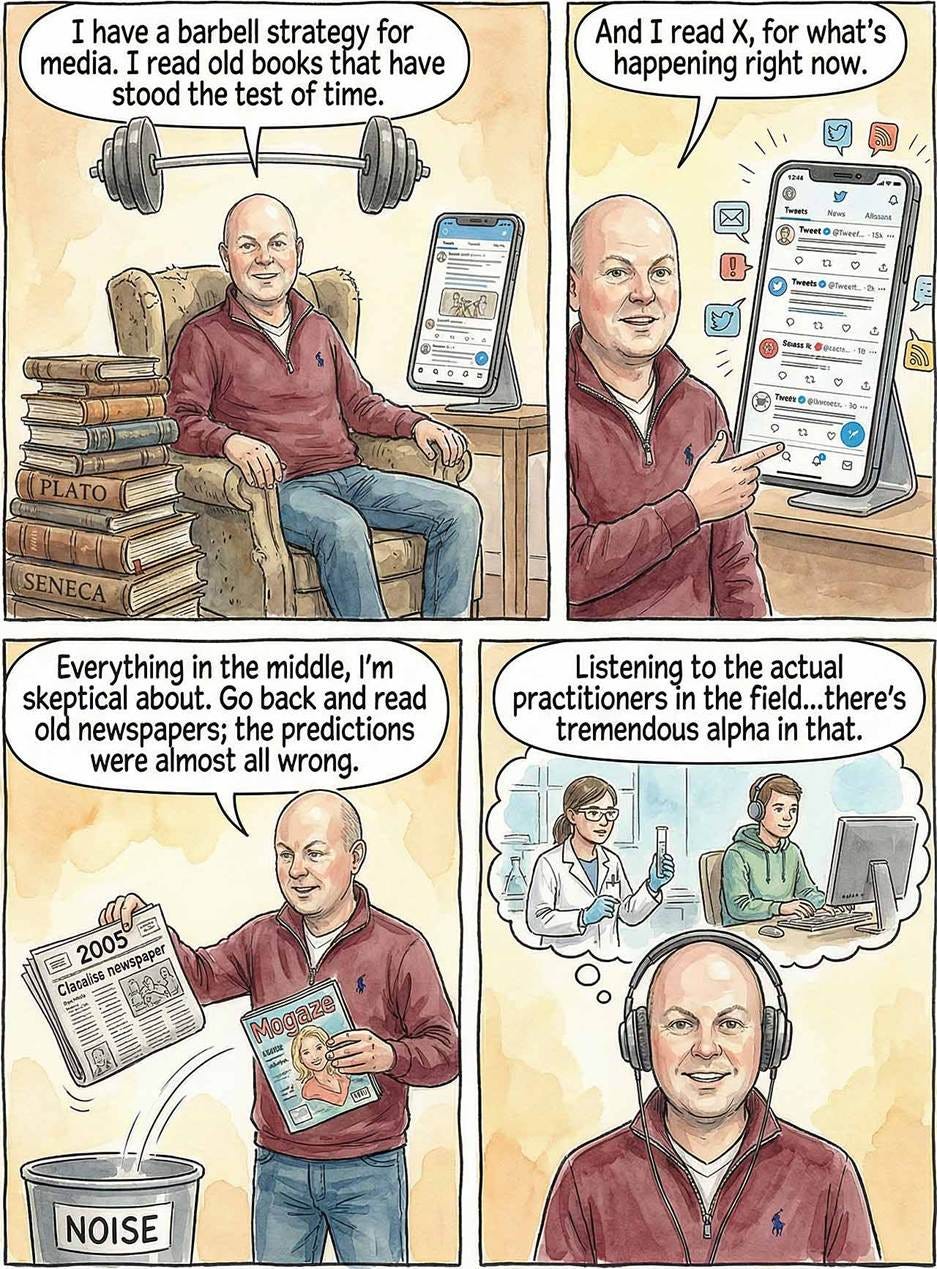 Marc describes his media consumption as a “perfect barbell strategy”: he reads X/Twitter for up-to-the-minute developments and old books (50+ years old) that have stood the test of time, while remaining deeply skeptical of everything in between. His reasoning: if you read last year’s newspaper, almost none of the predictions played out correctly, and magazines are even worse because their longer production cycles make content obsolete before publication. Instead, Marc prizes direct access to domain practitioners: founders, researchers, experts who actually do the work, through podcasts, newsletters, and Substack. He notes this represents a fundamental shift from the mass media era where everything was mediated through TV and newspaper interviews to today’s world where smart people explain themselves directly, providing “tremendous amounts of alpha” unavailable in traditional media.