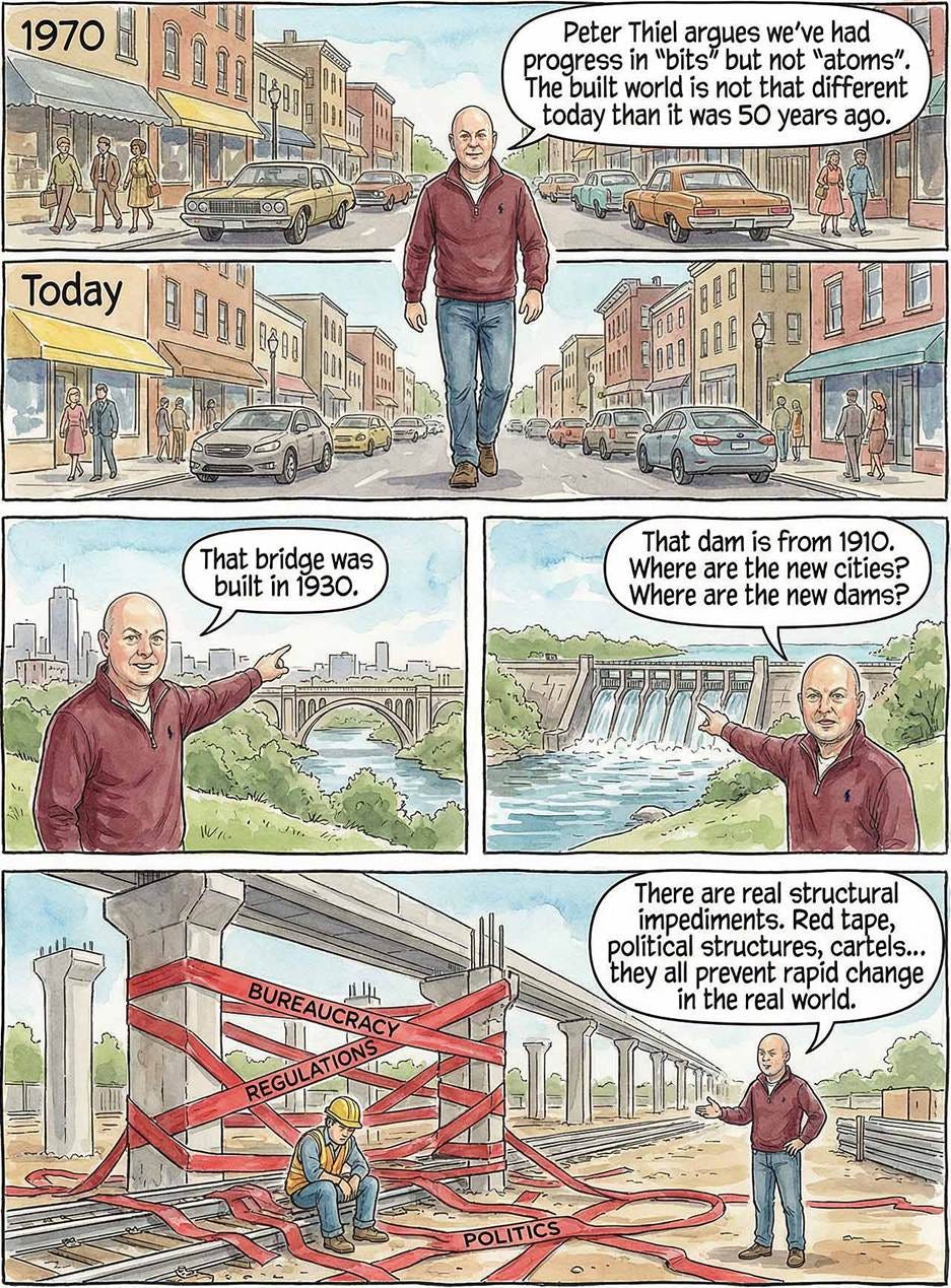 Marc acknowledges that Peter Thiel’s critique of technological progress (that we’ve had progress in “bits” but not “atoms”) is more correct than Marc initially gave him credit for. While the last 50 years feel like a time of great change, productivity growth statistics tell a different story: technological impact on the economy has been running at half the pace of 1940–1970 and a third the pace of 1870–1940. The physical world provides stark evidence: we still use bridges from the 1930s, dams from 1910, buildings from 1960, and cities founded in 1880. Marc asks pointedly: Where are the new cities, new dams, where’s the California high-speed rail? This stagnation stems from bureaucratic red tape, regulations, unions, cartels, and political structures that actively prevent change. These same forces will likely slow AI’s real-world impact, making utopian or dystopian predictions of overnight transformation unrealistic.