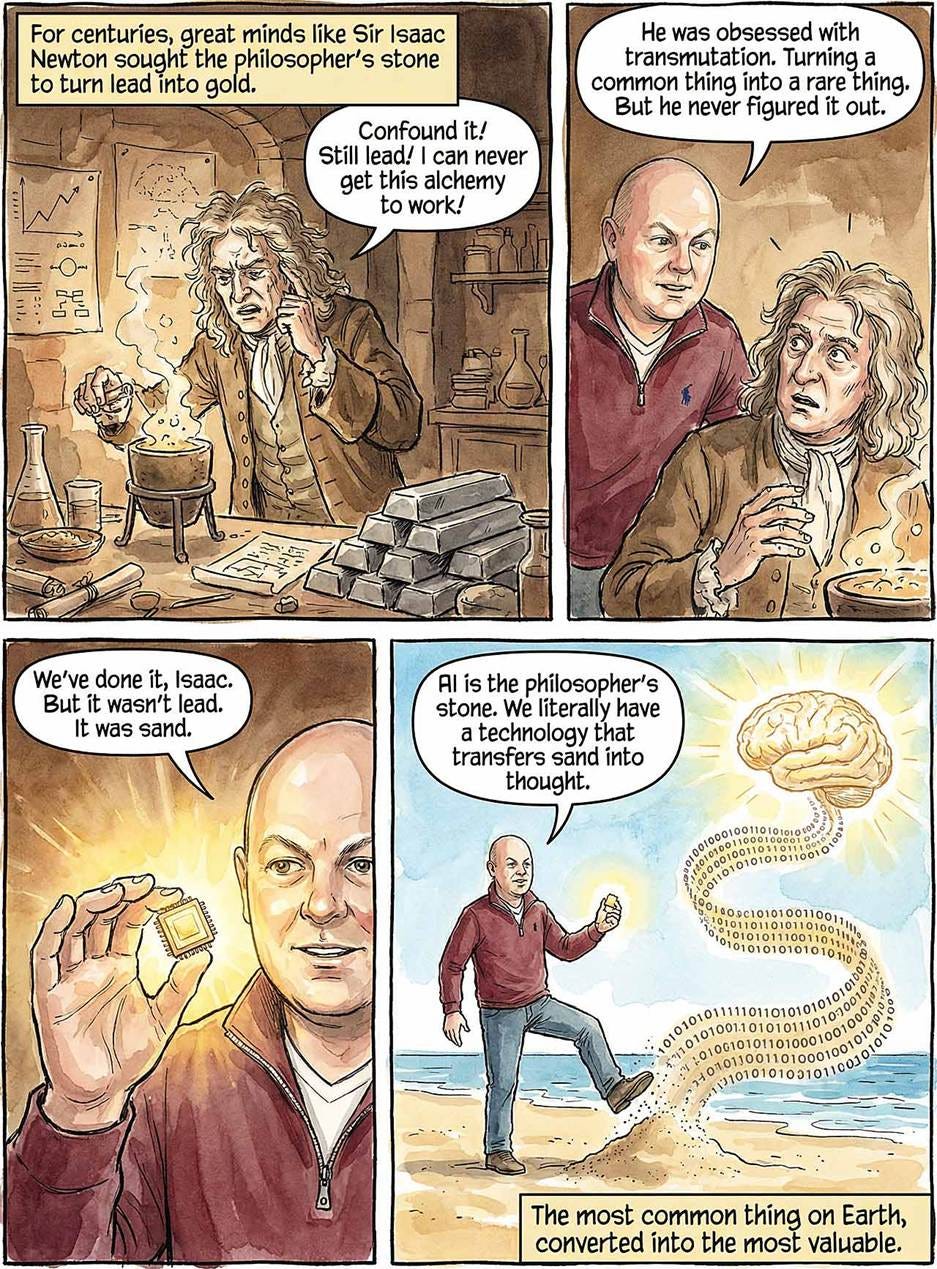 Marc draws a fascinating parallel between AI and the ancient alchemists’ quest for the philosopher’s stone. Scientists like Sir Isaac Newton spent decades obsessed with transmuting lead into gold: converting something common into something rare and valuable. They never succeeded. AI, Marc argues, has actually achieved something even more remarkable: it transforms sand (silicon, the most common element on earth) into thought (the rarest and most valuable thing). This framing positions AI not as incremental technological progress but as the realization of an age-old dream, making it “the philosopher’s stone” that alchemists could never discover. Marc emphasizes this to his 10-year-old son, teaching him that mastering AI is like learning to wield this magical tool that converts the mundane into the extraordinary.