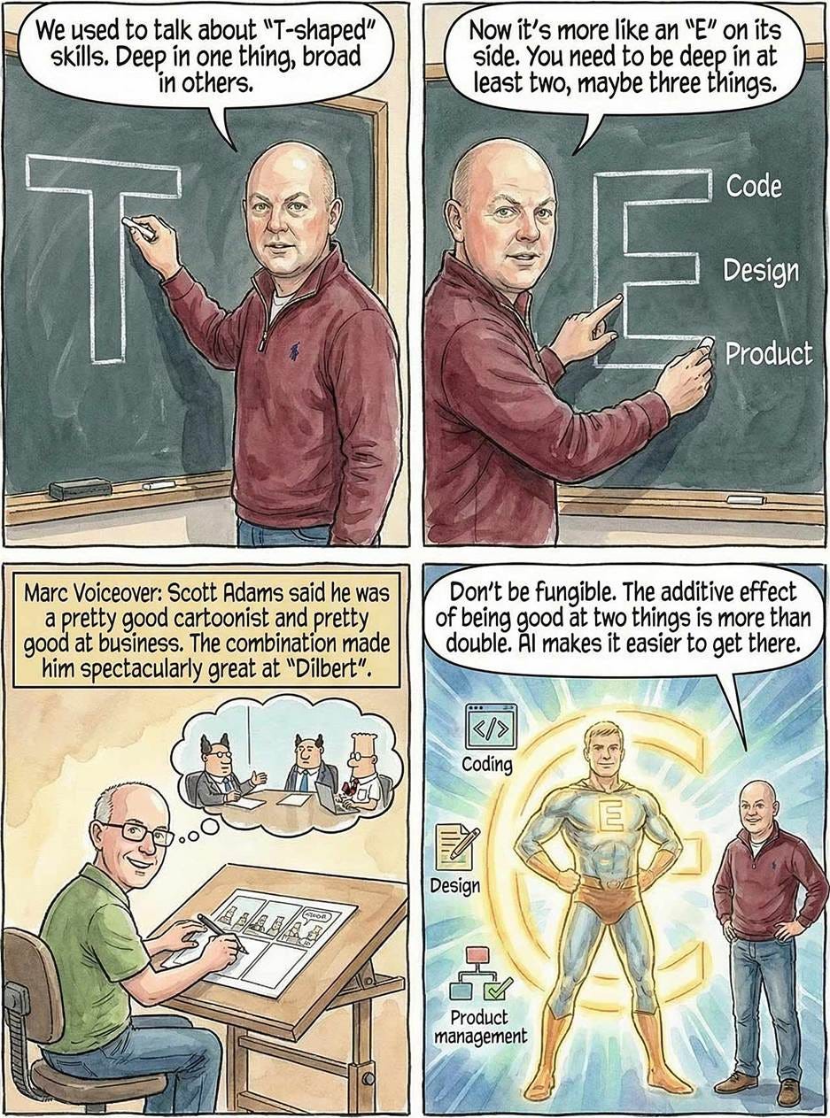 We are changing from a “T-shaped” to an “E-shaped” approach to career development, referencing the late Scott Adams’ career advice that being good at two things creates more than double the value, and three things more than triple. Adams couldn’t have created Dilbert as just a cartoonist or just a business person: the combination made him spectacularly great in a unique niche. Marc’s friend Larry Summers frames this as “don’t be fungible”: if you’re just one thing, you can be replaced, but rare combinations make you invaluable. In the AI era, the breadth of the “T” represents how many domains you can use AI tools to perform well in, while the depth represents your deep expertise in at least one area. Someone deep in coding who can use AI for design and product management becomes a “triple threat.” capable of feats previous generations couldn’t imagine.