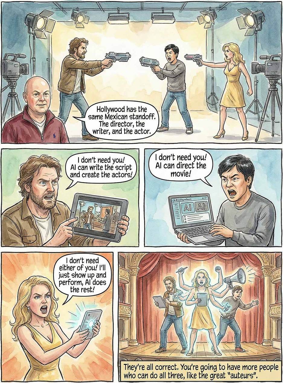 Marc extends his Mexican standoff analogy to Hollywood, where directors, writers, and actors are experiencing the same triangular tension. Directors now think they don’t need writers (AI can write scripts) or actors (AI can generate performances); writers believe they don’t need directors (AI can direct) or actors; actors think they can have AI handle writing and directing while they simply perform. Each participant in this triangle believes they can eliminate the other two roles. Marc suggests this disruption may actually benefit creative talent: more people will be able to combine writing, directing, and acting capabilities; the combinations that historically produced the greatest “auteurs.” Hollywood calls these multi-talented creators who can write and direct (or write and act, or do all three) the true creative forces that move the industry forward.