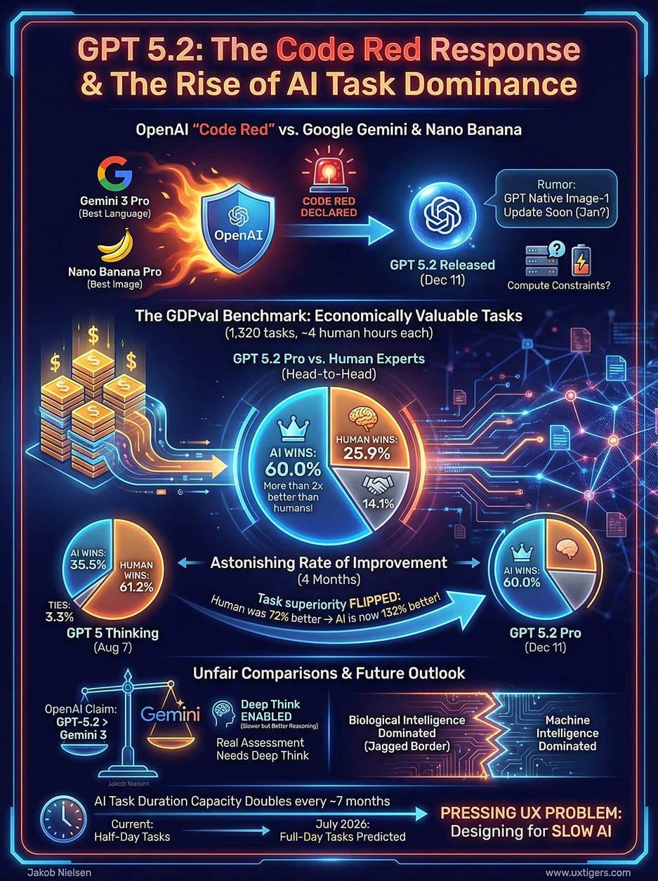 Summary: How People Use AI for professional and creative jobs | AI conducts user interviews at scale, converting qualitative quotes to quant data | When and how to hire the first designer in a startup company | Prompt engineering debunked: Don’t specify a mastery persona | Longitudinal user research needed to judge AI agent usability | A new generation of power turbines may meet the need for AI electricity | GPT 5.2 132% better than human experts on economically valuable tasks